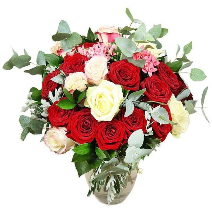 Celebrate lasting moments with our timeless red and white rose arrangement. This elegant bouquet features a balanced mix of red and white roses, complemented by fresh eucalyptus and charming bouvardia, creating a visually stunning and unique display.