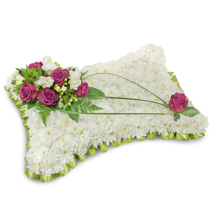 Offer your sincere condolences with our luxurious pillow-shaped tribute, artfully arranged with white chrysanthemums, vibrant purple roses, elegant white freesias, delicate dianthus, and soft bear grass. This unique arrangement beautifully conveys messages of love and peace.