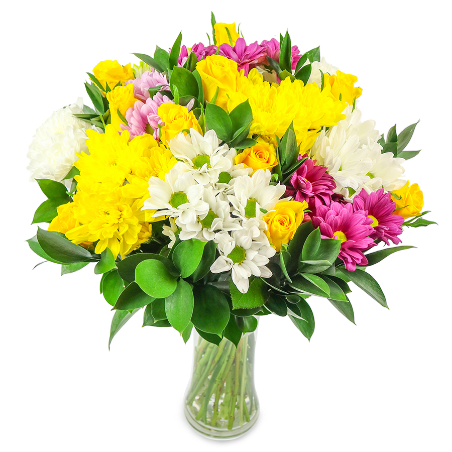 Embrace the spirit of celebration with our Joyful Bloom Extravaganza. This spectacular bouquet dazzles with a vibrant mix of golden yellow roses, joyful yellow chrysanthemums, crisp white spray chrysanthemums, and striking purple and pink variants, all beautifully accented with lush ruscus. Every flower is carefully hand-selected to ensure superior quality and a luxurious look.